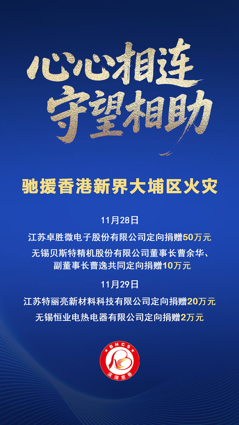 11月28日,无锡市滨湖区慈善基金会收到首笔江苏卓胜微电子股份有限公司定向捐赠50万元人民币,紧随其后,无锡贝斯特精机股份有限公司副董事长曹逸代表其父亲曹余华俩人共同定向捐赠10万元人民币。11月29日,正在外地出差的江苏特丽亮新材料科技有限公司董事长徐正良紧急安排财务人员定向捐赠20万元,特丽亮还将持续关注灾情进展,心系香港同胞的安危,愿与社会各界携手,为灾后重建贡献“特”力量。当天,无锡恒业电热电器有限公司创始人王春花也代表公司定向捐赠2万元,她在留言里留下了,“为香港新界大埔火灾略尽微薄之力,一方有难,八方支援,愿逝者安息”心声。